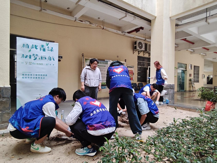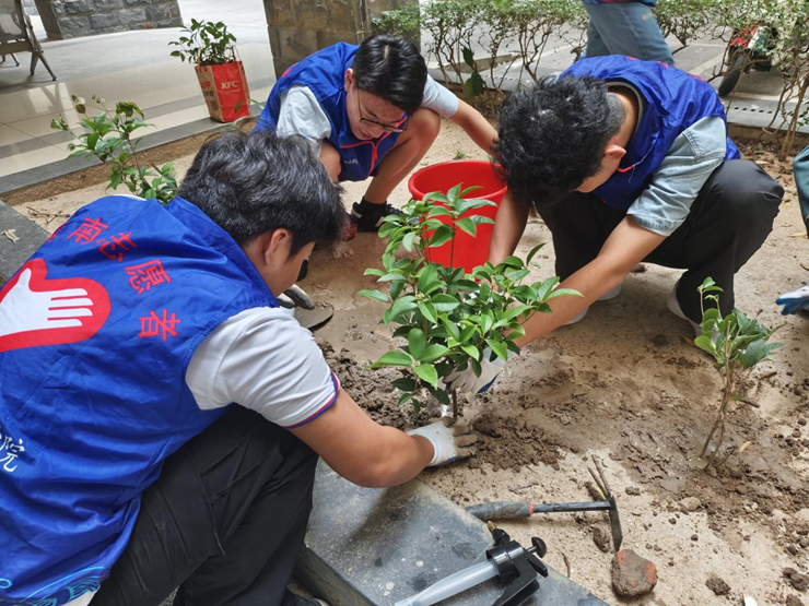 活动现场,学生志愿者与老师在学校9栋空地共同种植树苗。同学们分工协作,挥锹挖坑、扶苗培土、提桶浇水,每一道工序都凝聚着汗水与热情。